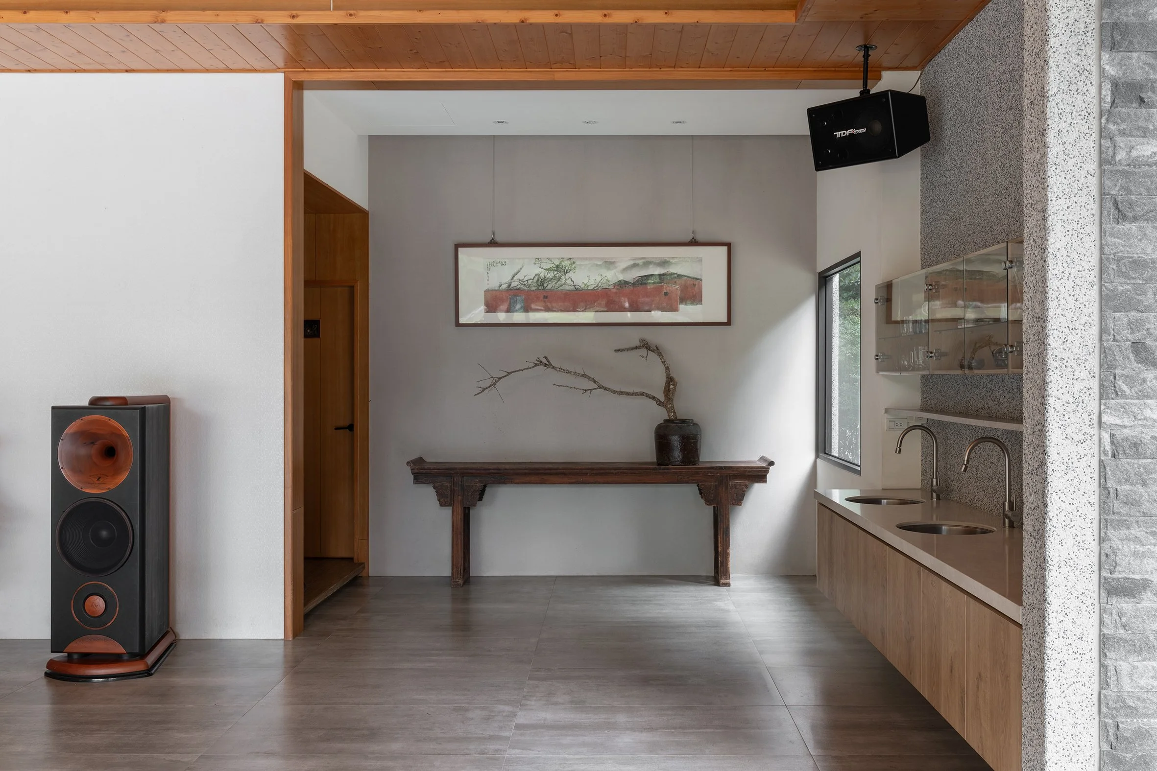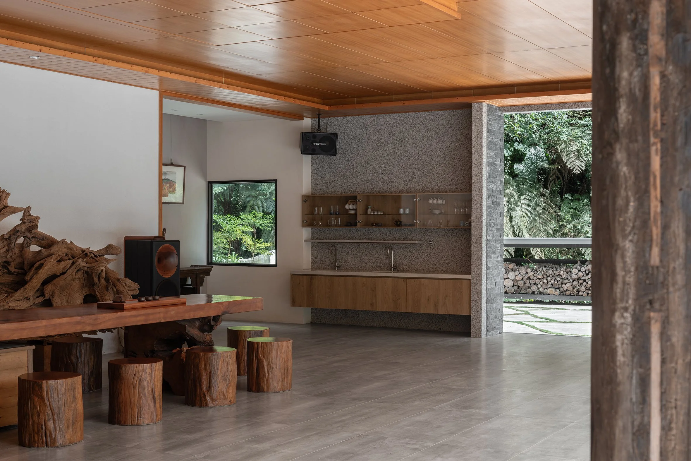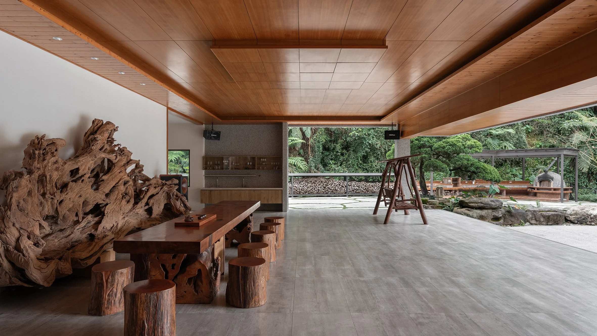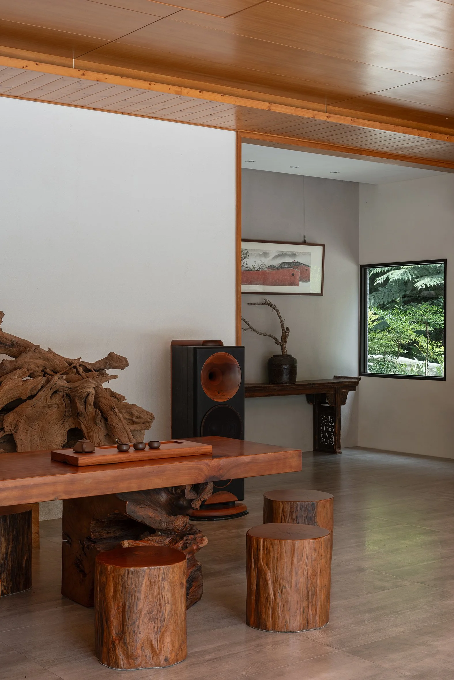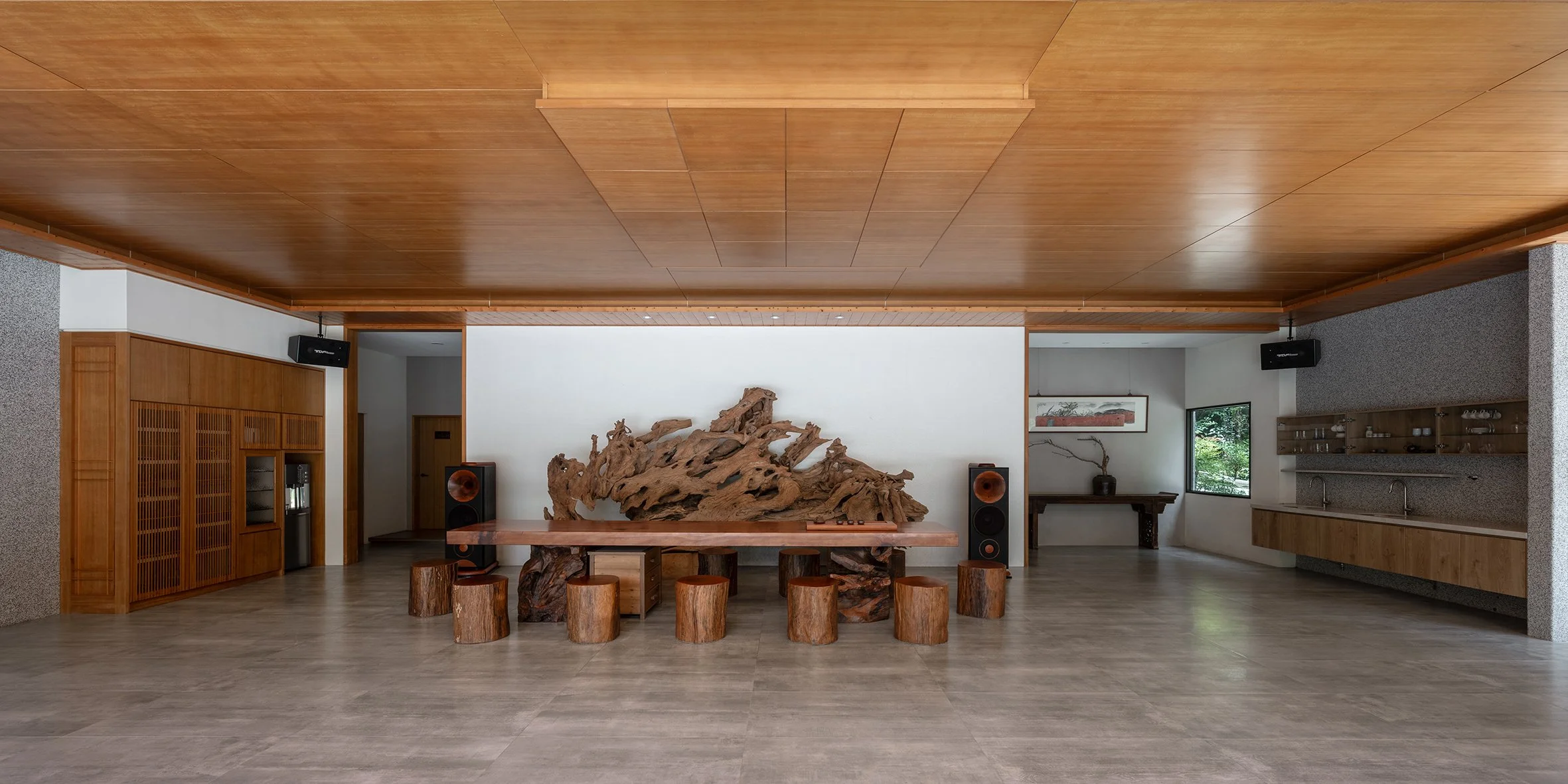 At the heart of the guesthouse is a 105-square-meter covered outdoor pavilion—completely column-free, allowing for an unobstructed sense of openness and connection to the surrounding landscape. At the center of this space sits a 4.5-meter slab of timber used as a communal table, inviting meals and shared moments. Just behind the table, a striking fossilized tree root rests as a sculptural backdrop, its naturally intricate formations and textures formed over time, resembling an organic work of art. This space serves as the social soul of the guesthouse, used for hosting intimate dinner events, enjoying tea with friends, watching movies under the open air, or gathering for karaoke and celebration.