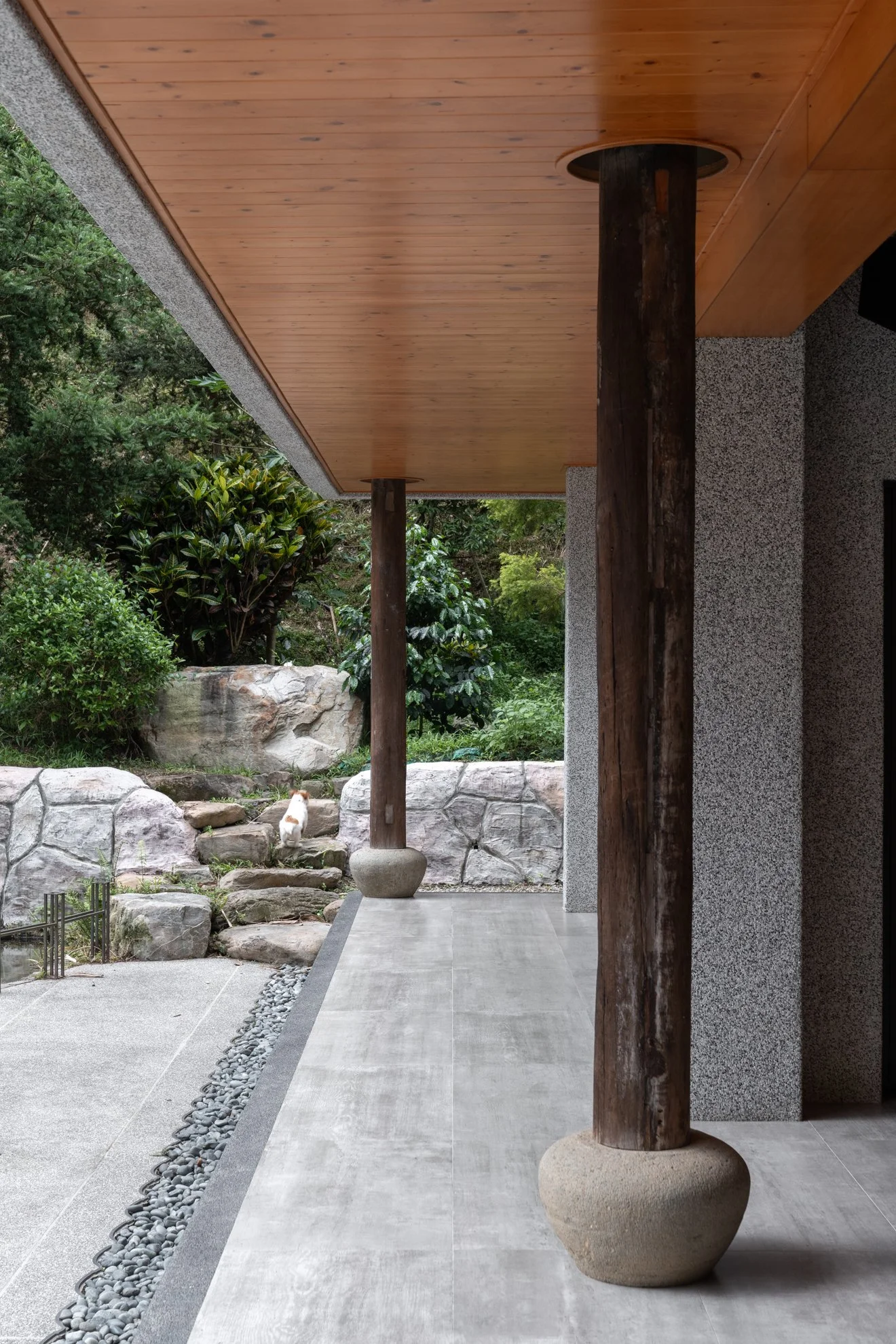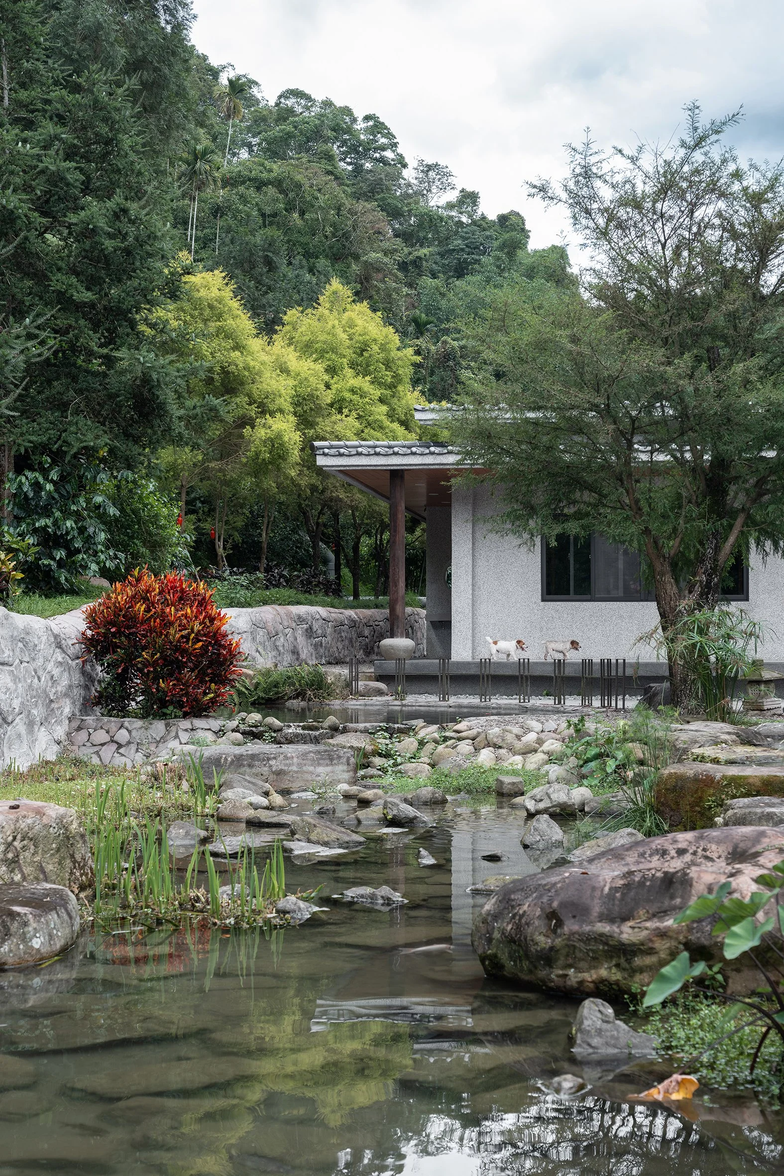 The structure presents a low, elongated profile capped with a gently sloping tiled roof that echoes the form of vernacular Taiwanese and Japanese rural homes. Its walls are finished in light pebble-dash concrete, lending both texture and neutrality, allowing the richness of the surrounding garden and forest to take visual precedence. A deep overhanging eave frames a generous shaded veranda that blurs the line between interior and exterior, encouraging slow movement and quiet contemplation.