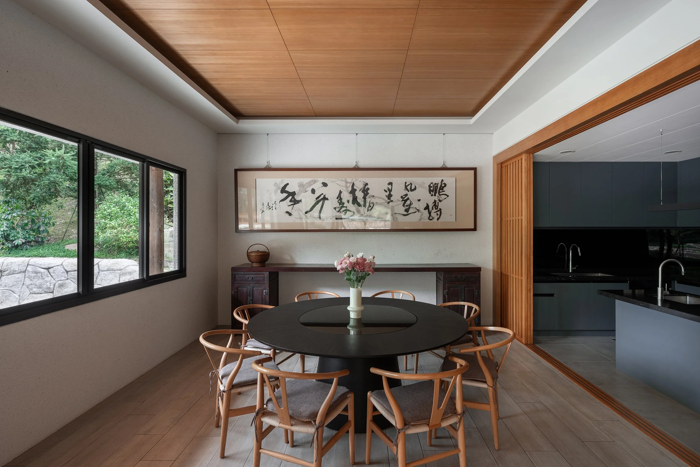 Tucked into the lush green folds of a forested hillside, this guesthouse is a serene and contemplative retreat, harmoniously blending traditional East Asian design sensibilities with modern architectural restraint.