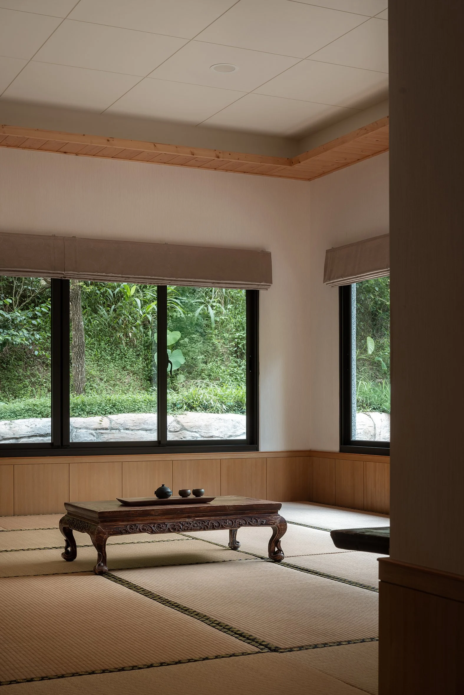 Adding to its unique character, the guesthouse is furnished with a curated collection of antique Chinese furniture from the Ming Dynasty. Elegant cabinets, finely crafted side tables, and timeless wooden details bring a sense of history and cultural richness to the interior, creating a warm and dignified atmosphere that echoes the beauty of its natural surroundings.