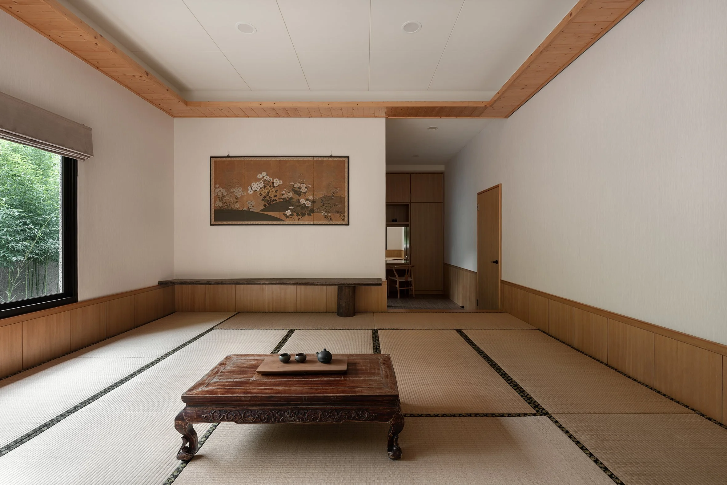 The guesthouse itself blends traditional charm with comfort. A fully equipped kitchen and dining room serve the needs of guests, while a large tatami room offers accommodation in the traditional style, its simplicity underscored by a framed floral painting and shoji-inspired paneling. The room is designed for rest and meditation, with soft natural light filtering in from a bamboo-framed window. Furnishings are sparse and intentional, reflecting the wabi-sabi aesthetic of understated elegance and impermanence.