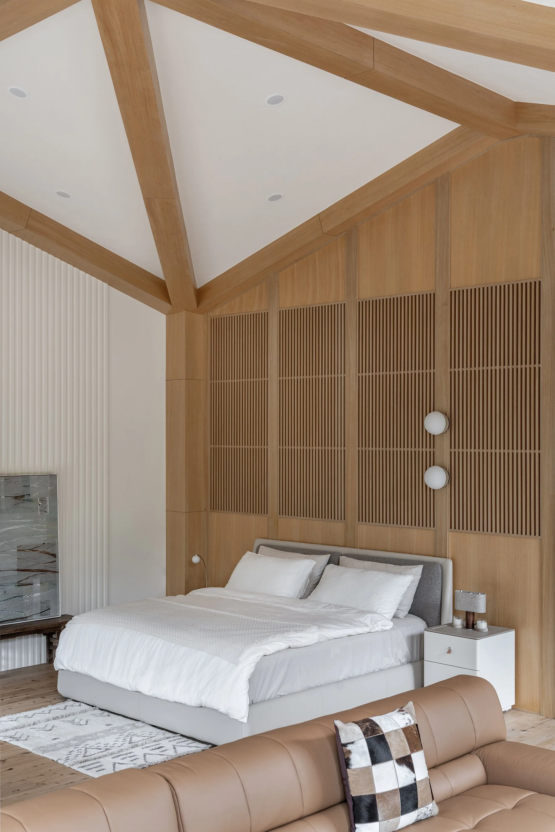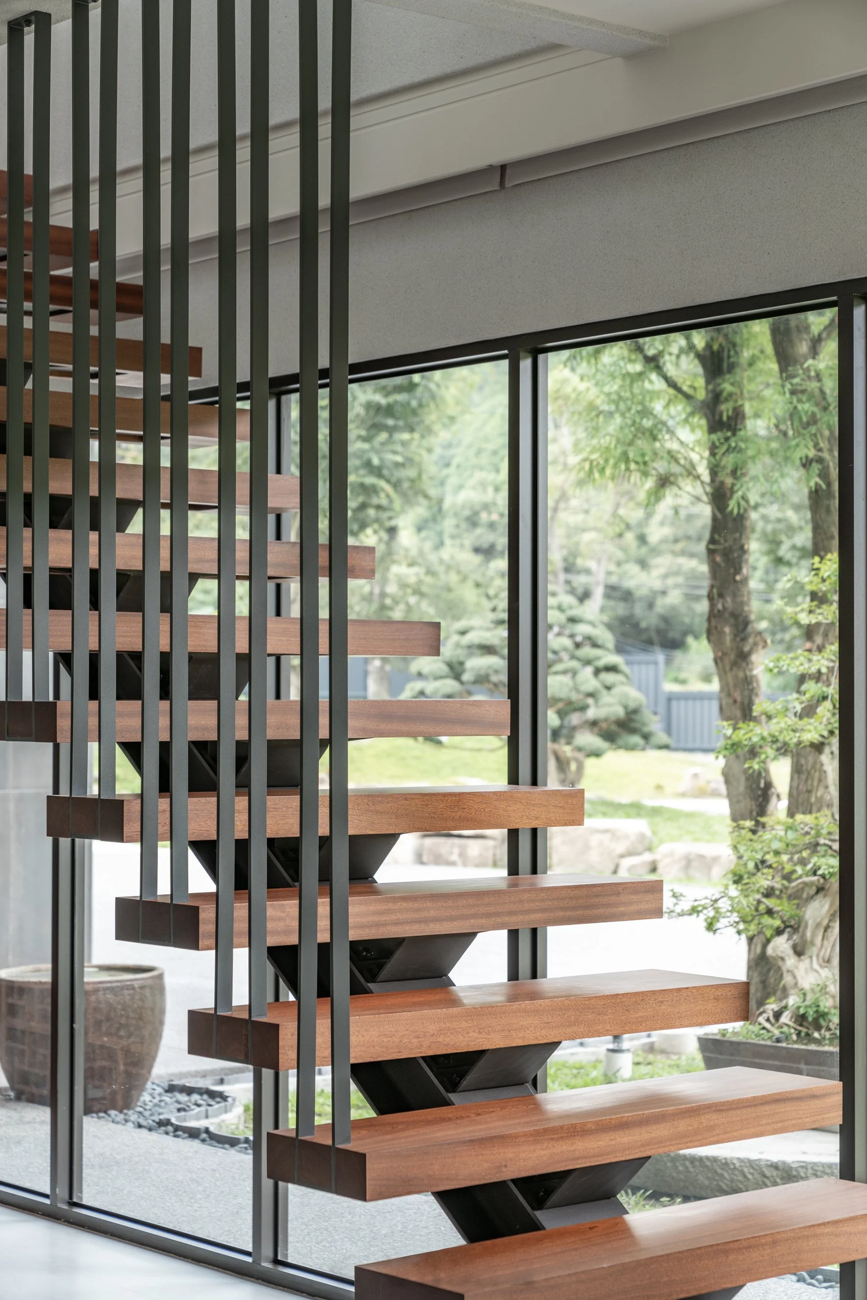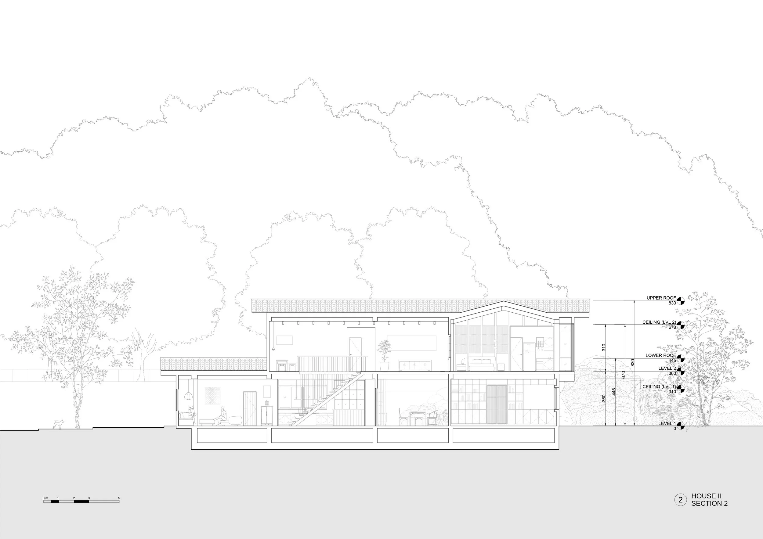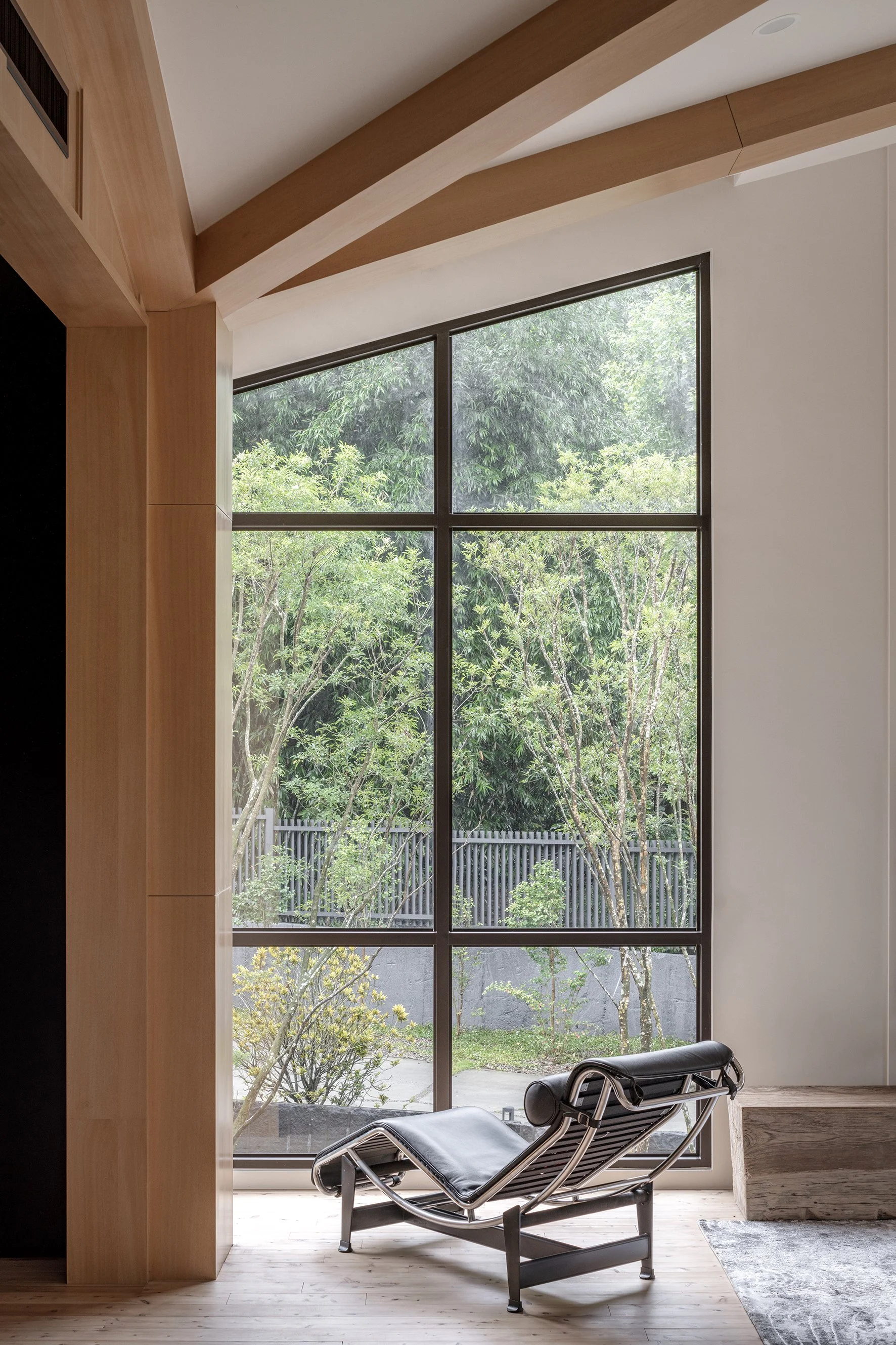 Generous floor-to-ceiling windows bring the natural environment indoors. On the ground floor, they open out to the garden, while on the second floor they bring distant mountains into the frame—a nod to the Japanese concept of shakkei, or “borrowed scenery.” The natural landscape beyond the boundary of the property is brought into the house, blurring the boudnaries between man-made and natural spaces.