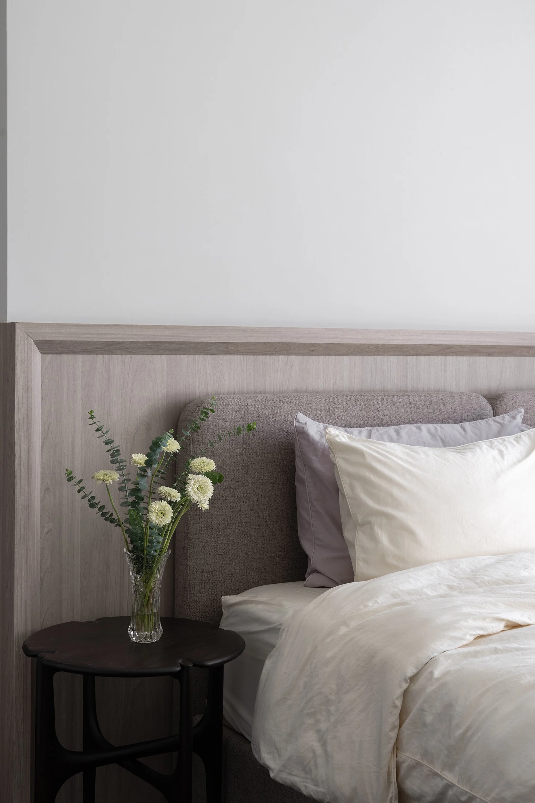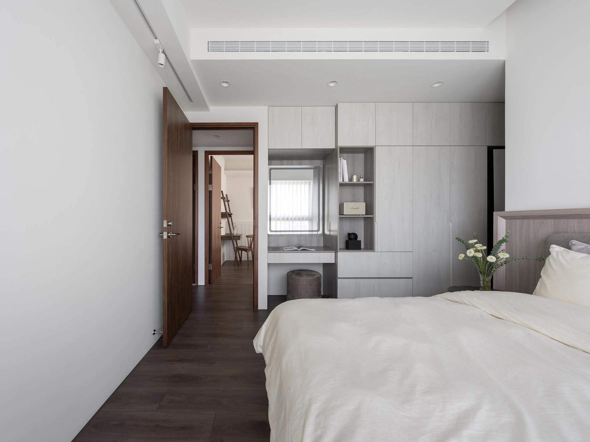 The primary bedroom is a study in soft luminosity—the expansive windows, dressed in sheer curtains, diffuse natural light into a gentle haze. Outside greenery filters through the fabric, casting delicate shadows across the bedding and floor—turning natural light into a moving texture that animates the otherwise quiet space. A custom headboard wall, wrapped in subtle wood tones, creates a cocooning effect that anchors the room without weight. Storage is seamlessly integrated along one wall through full-height cabinetry, punctuated by a built-in vanity and open shelves that display a few curated objects. This thoughtful millwork maintains the room’s uncluttered feel while adding functionality and a touch of architectural elegance.