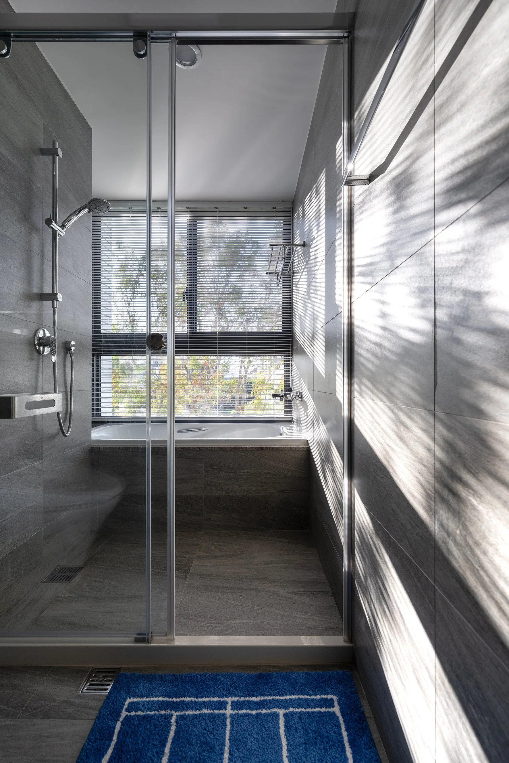 A serene, light-filled bathroom becomes a meditative space where light and shadow are part of the material palette. Through the blinds, the tree outside filters sunlight into delicate, shifting patterns, casting organic shadows across the gray tiled walls and floor. The branches and leaves create a textured choreography of light, softening the clean geometry of the bathroom and infusing the space with a sense of nature and movement.