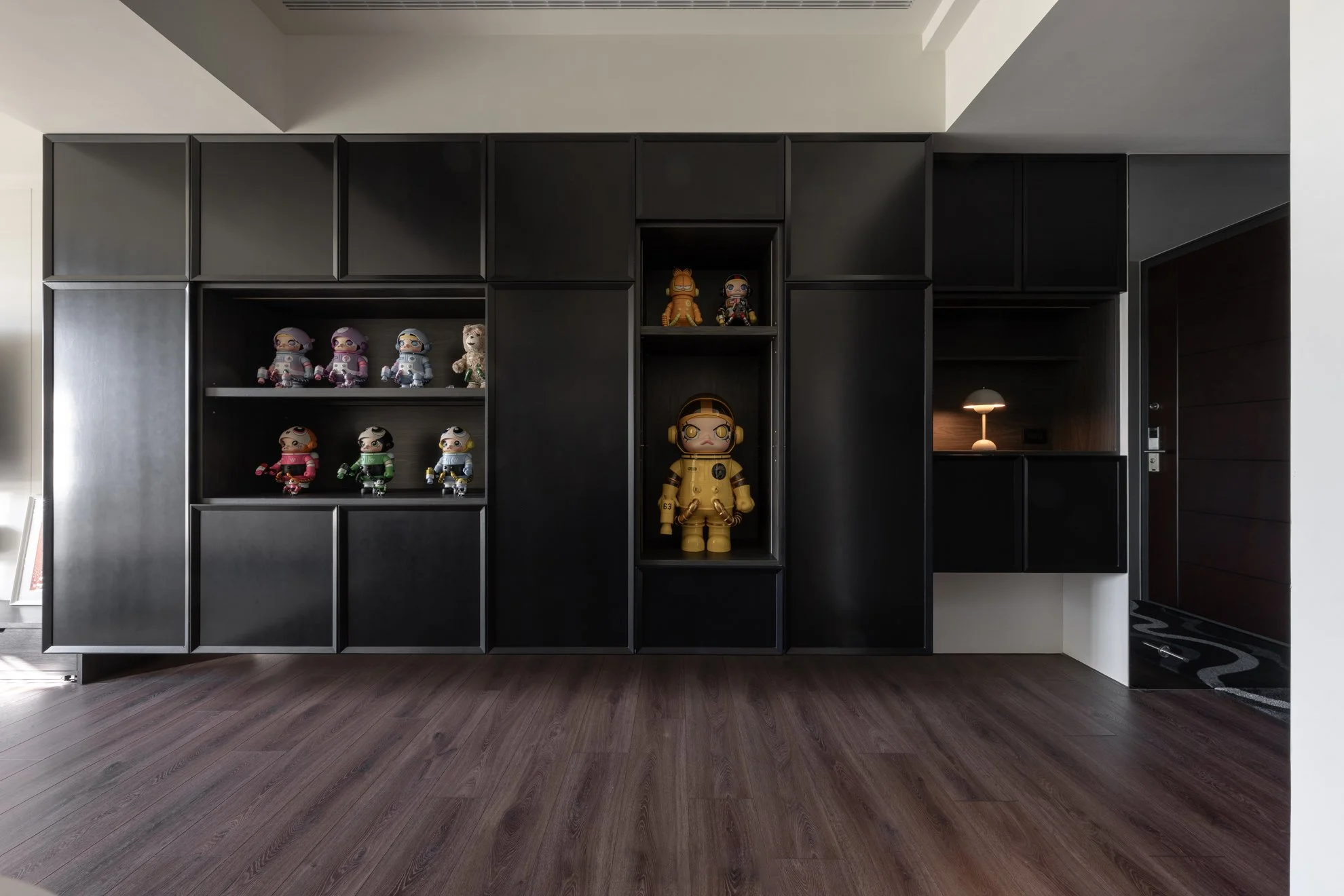 Designed for a bachelor in his early thirties, this apartment presents a compelling dialogue between restraint and whimsy—an elegant, contemporary home that quietly reveals its owner’s inner world. At its core is a disciplined architectural language of deep matte blue, black wood, warm whites and sculptural light, yet threaded throughout are the vivid characters of his treasured collectible art toys. Rather than disrupt the calm, these figures animate the interiors with moments of color, humor, and intimacy, transforming the displays into curated vignettes that chart a personal journey.